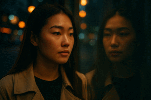 Para reforçar o efeito, posicione a câmera frontal levemente de lado e ajuste a iluminação para que uma parte do rosto fique iluminada e a outra em sombra suave. Isso adiciona drama e realce.